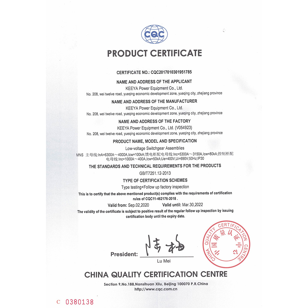 MNS低压抽出式开关设备 英 CQC认证证书
