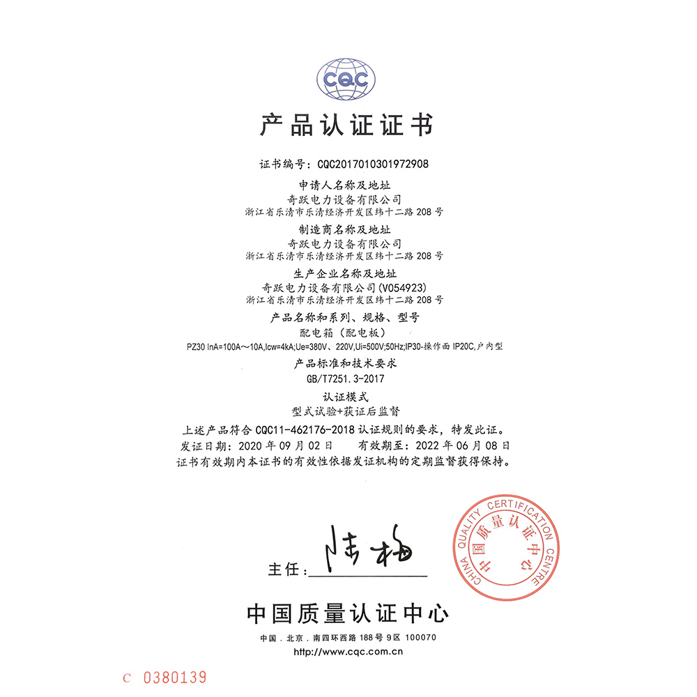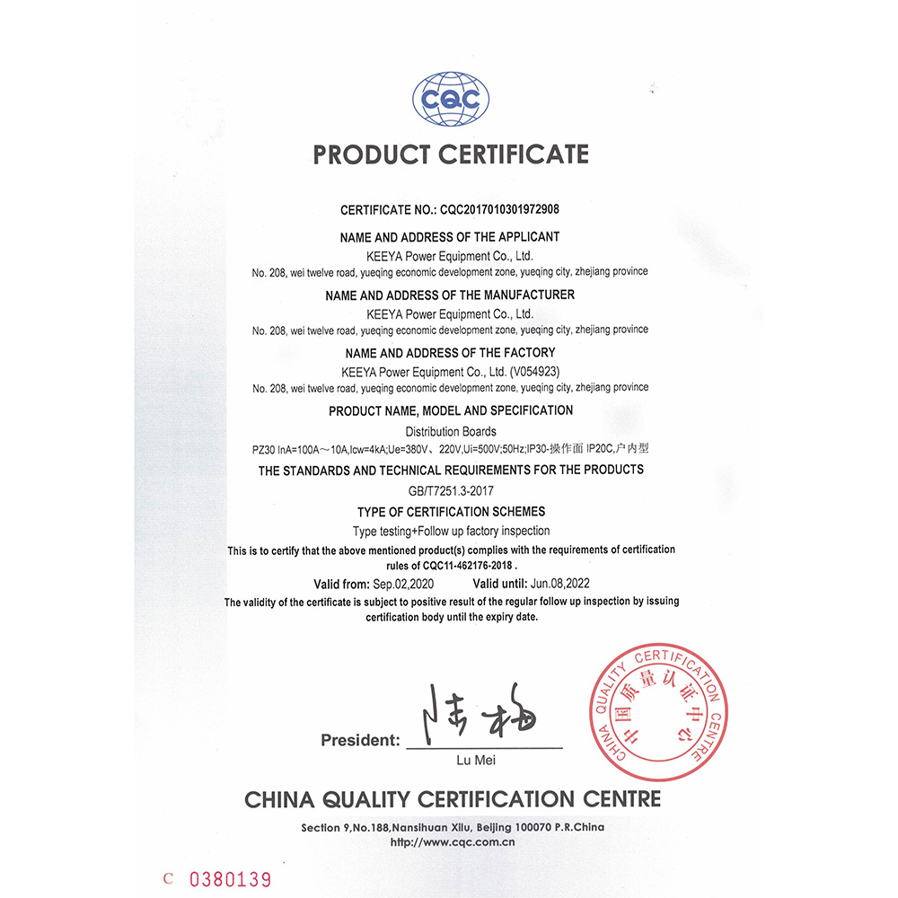 PZ30配电箱 英 CQC认证证书