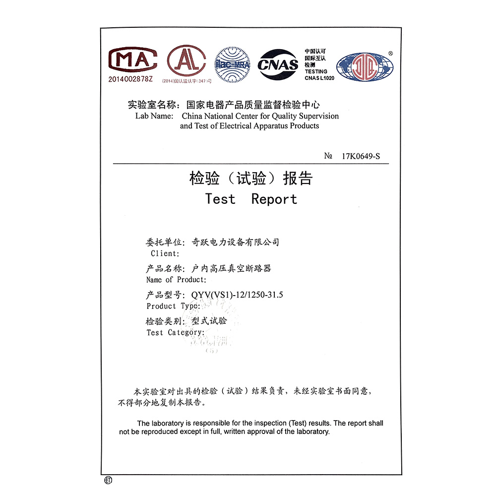 QYV(VS1)-12/1250-31.5户内高压真空断路器 检验报告