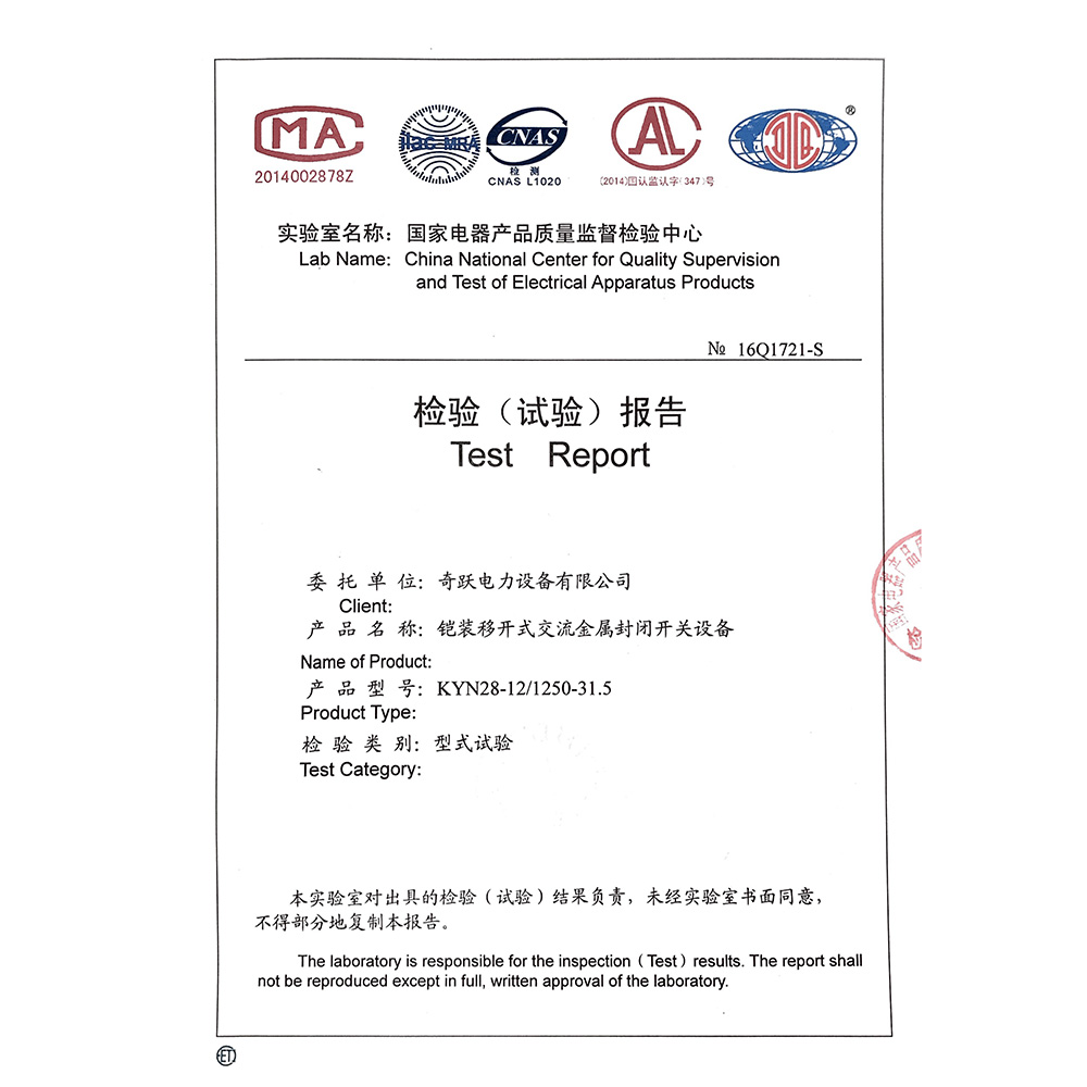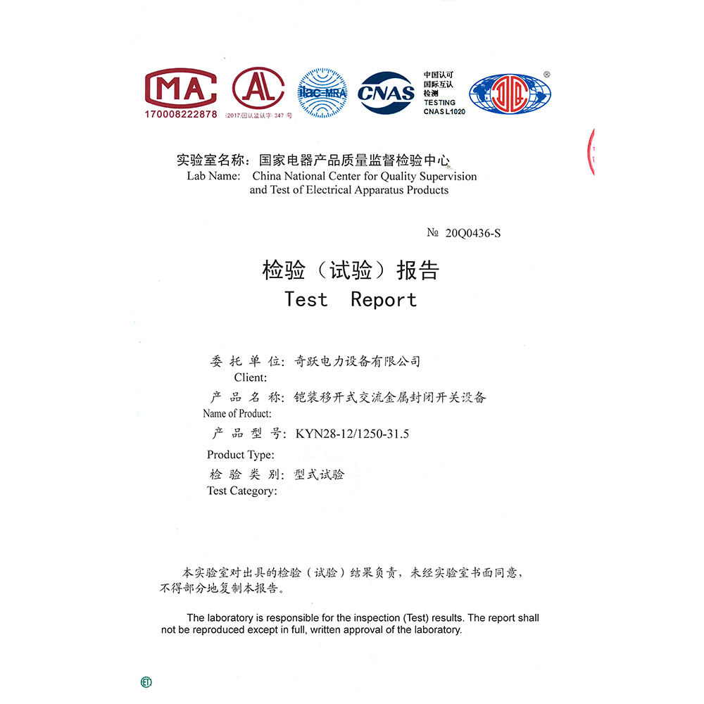KYN28-12/1250-31.5铠装移开式交流金属封闭开关设备 检验报告
